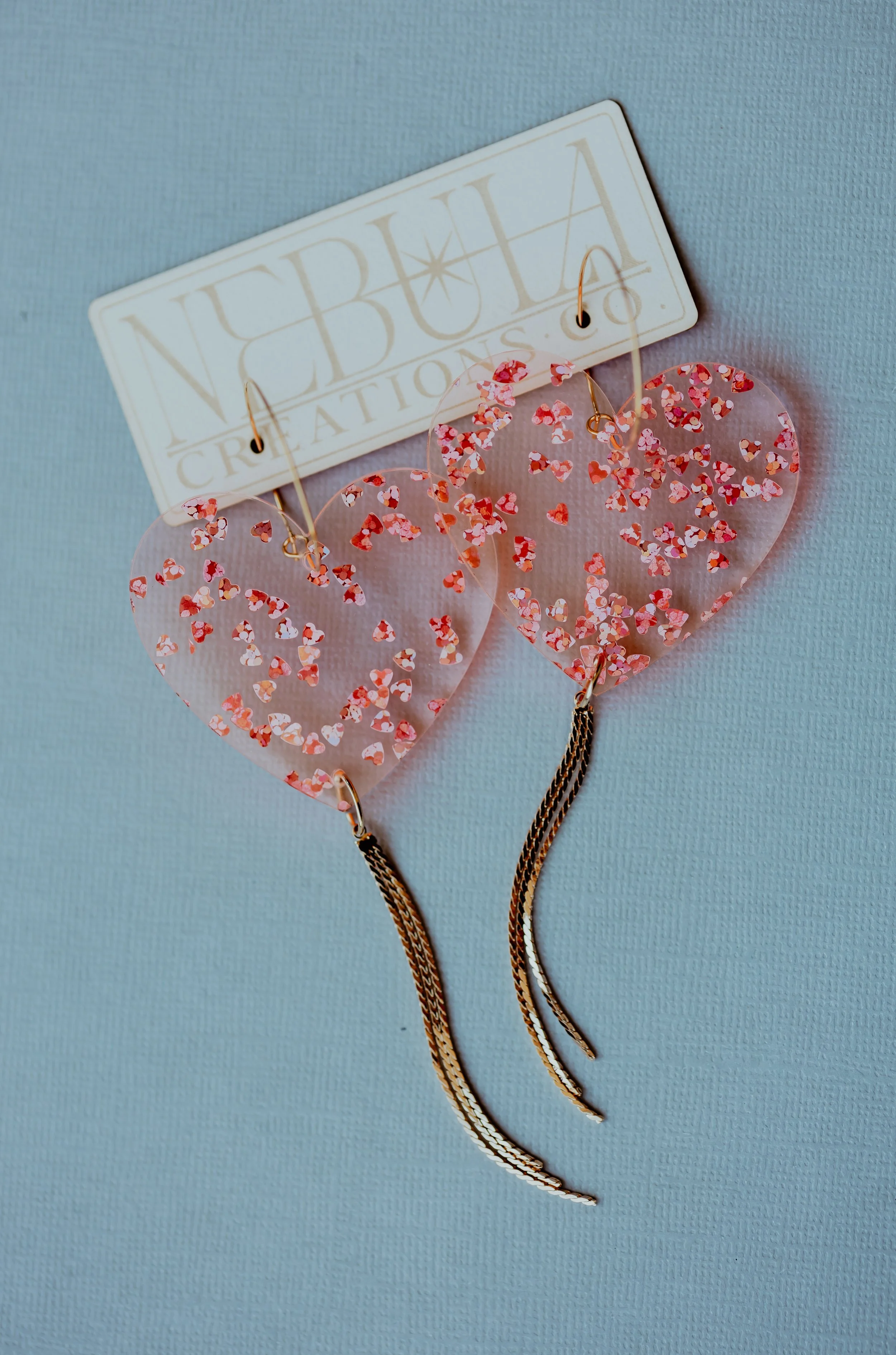 This pair of dazzling glitter heart earrings with gold tassels was artistically designed and crafted. Constructed from acrylic, this piece was thoughtfully hand drawn, then precisely cut by laser, to bring you this unique wearable art.